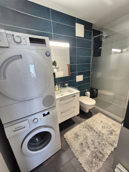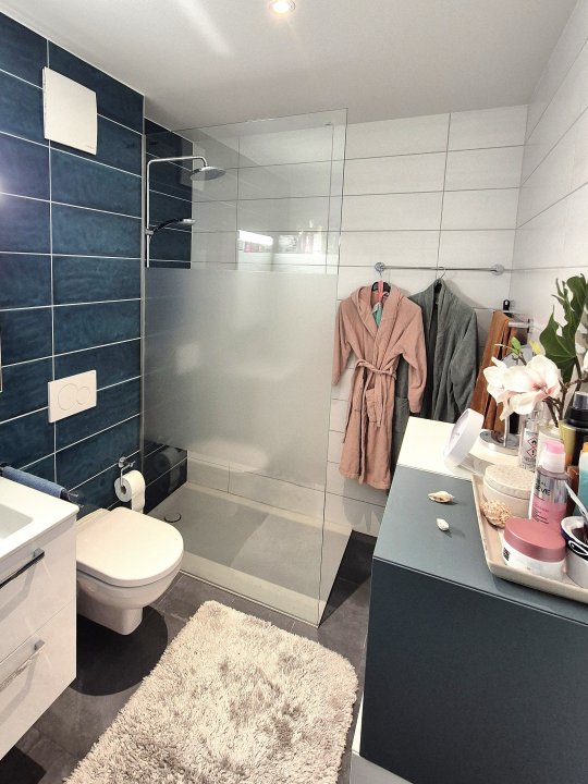 - salle de bain de 5,4 m2 avec grande douche italienne, Wc, buanderie, attenante à la chambre parentale.