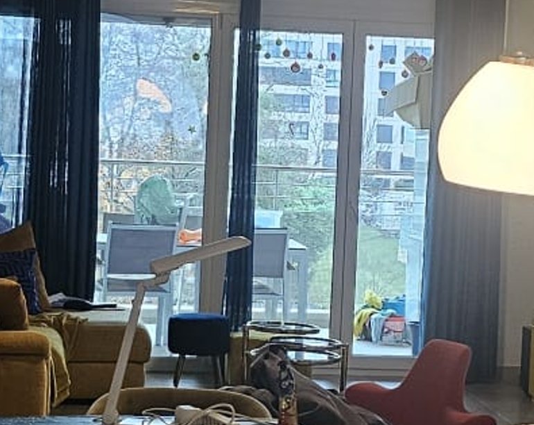 Grand séjour lumineux ouvert sur la cuisine, avec accès direct au balcon côté parc.
